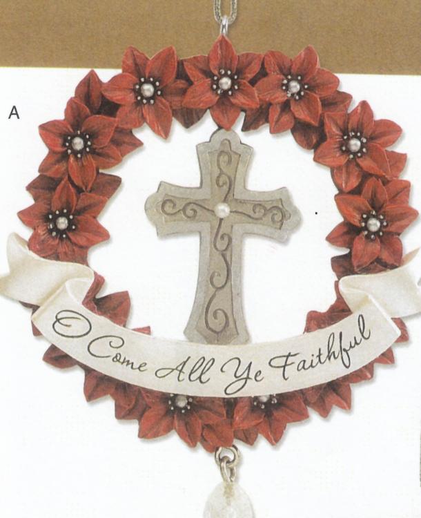 New intricately carved poinsettia and holly wreath ornaments display banners noting favorite Christmas hymns. Symbols of Christmas and crystal bead drop accents make each ornament unique.