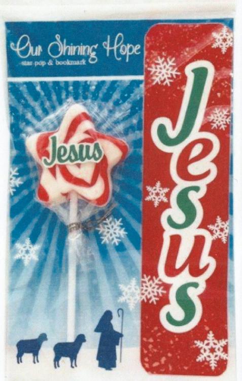 Each set includes a cherry-flavored swirl star lollipop and a bookmark with Jesus and a scripture verse printed on it. The pop and insert board display the Jesus, Our Shining Hope theme. Makes a great stocking stuffer.