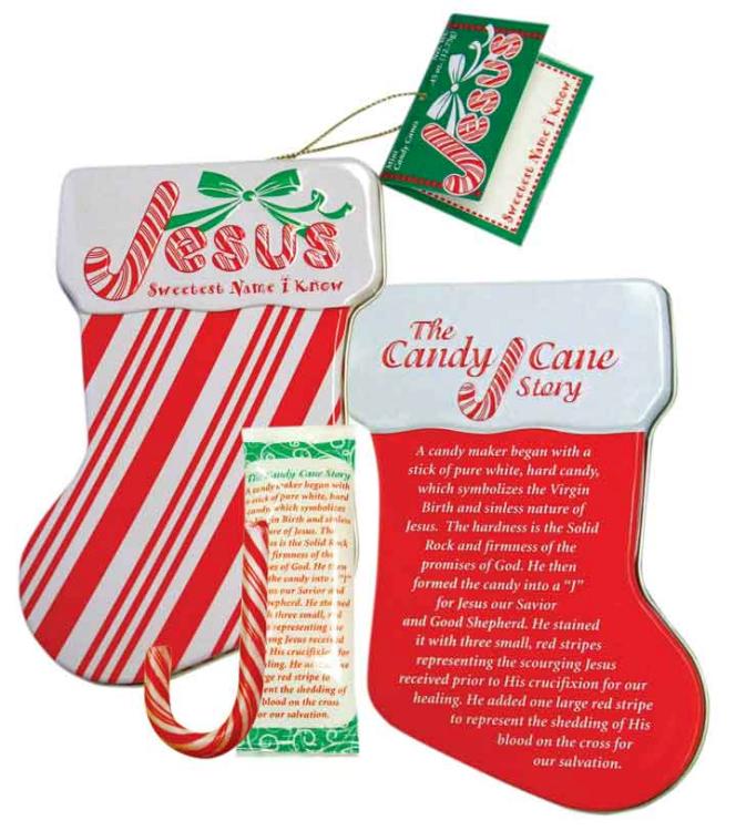 This “Jesus Sweetest Name I Know” embossed stocking-shaped tin can be hung as a tree ornament. It features “Jesus Sweetest Name I Know” on the front and “The Candy Cane Story” on the back. Each tin includes mini candy canes individually wrapped in “The Candy Cane Story.” It is adorned with a decorative hangtag that includes a “To: / From:” signature area for ready gift-giving.