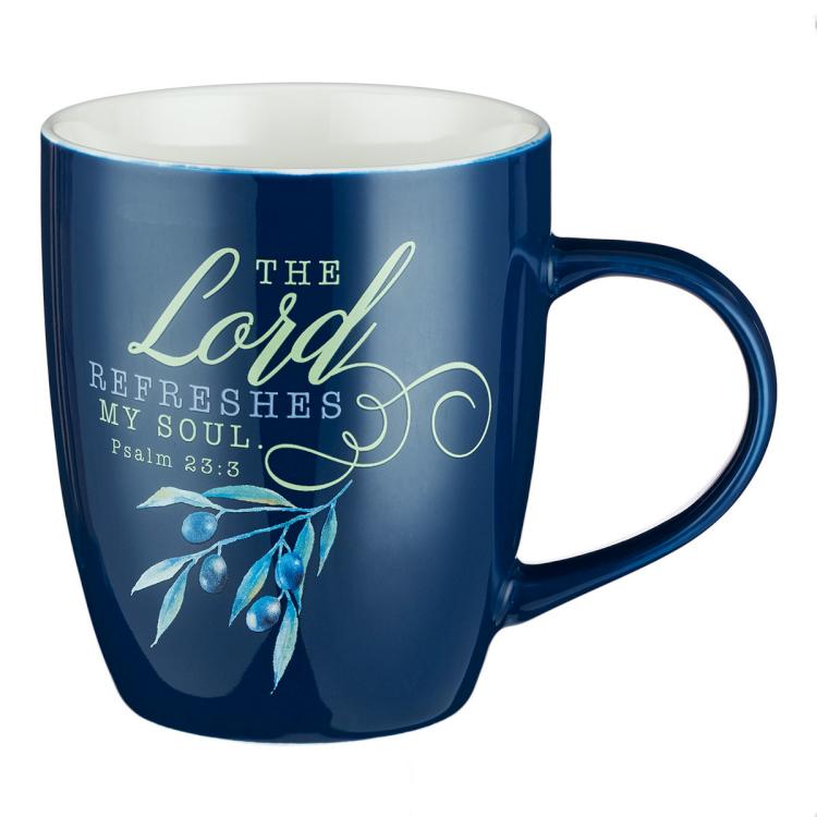The Lord Refreshes My Soul Coffee Mug is made of ceramic with the The Lord refreshes my soul verse on the front of the Christian gift and an olive branch design alongside the verse. With a 13-ounce capacity, the navy mug will keep your coffee, tea or hot cocoa and enjoyable to the very last sip.