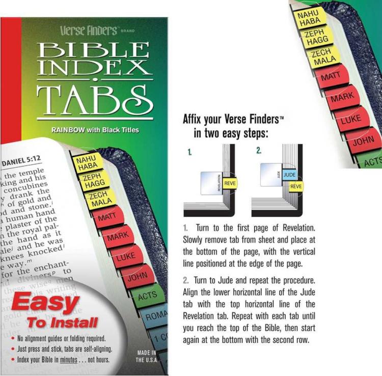 Features: Easy to install – no alignment guides or folding required. Just press and stick. Tabs are self-aligning. Index your Bible in minutes…not hours. Attractive and durable for years of trouble-free use. Horizontal style – reads left to right. Compact 3/8″ design indexes a standard Bible in only 2 rows, making books easier to find.